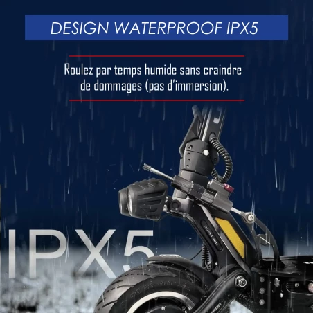 Minimotors nous gratifie enfin d’une trottinette plus résistante à la pluie et au mauvais temps. La Thunder 3 est annoncée IPX5 au niveau du deck et IPX7 pour le LCD.