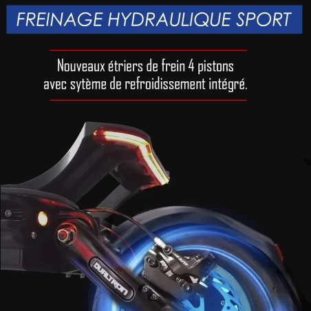 Le freinage est amélioré et bénéficie d’étriers à 4 pistons, de quoi arrêter efficacement cette trottinette électrique surpuissante ! L’avant de cette nouvelle Thunder possède également 2 phares puissants comme ceux de la Victor Luxury plus et un système Leds amélioré. L’amortisseur de direction normalement fourni en option est maintenant installé de série.