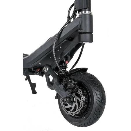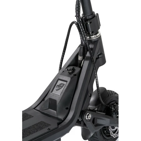 Les gros points forts de cette trottinette électrique sont le confort et la compacité. En effet, le tout nouveau châssis est agréablement compact et joueur, sans sacrifier les suspensions, digne de la marque. La batterie prend toute la place sous le deck, et les contrôleurs sont enfermés dans un boitier à l’avant du châssis, au niveau du bras support de direction.